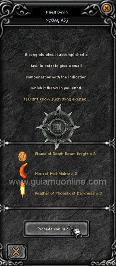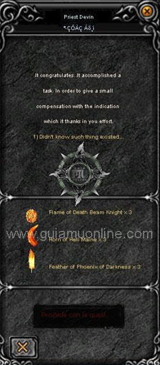 - Condiciones para completarla : Debes de colectar los 3 objetos que se piden: Flame of Death Beam Knight, Horn of Hell Maine, y una Feather of Phoenix of Darkness.